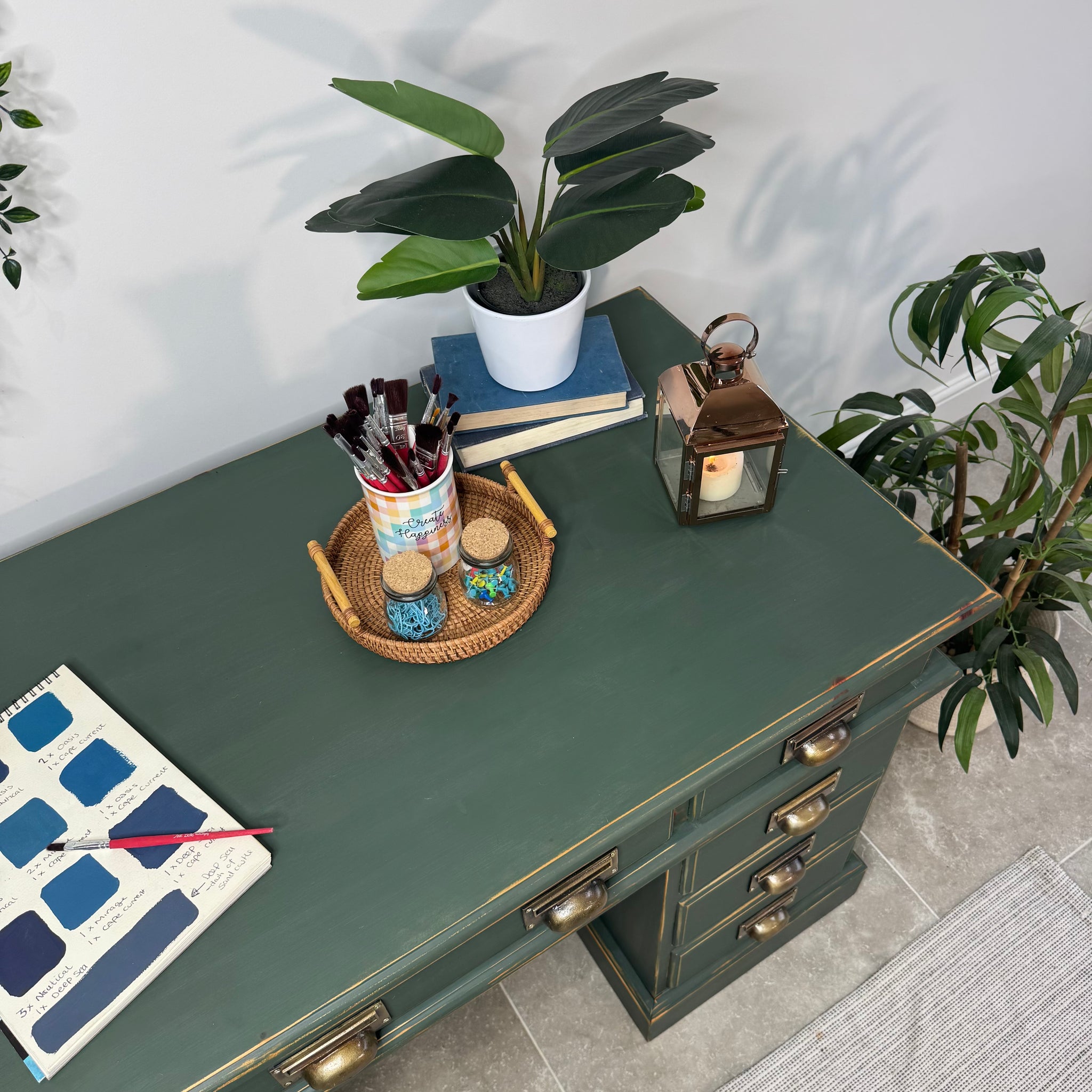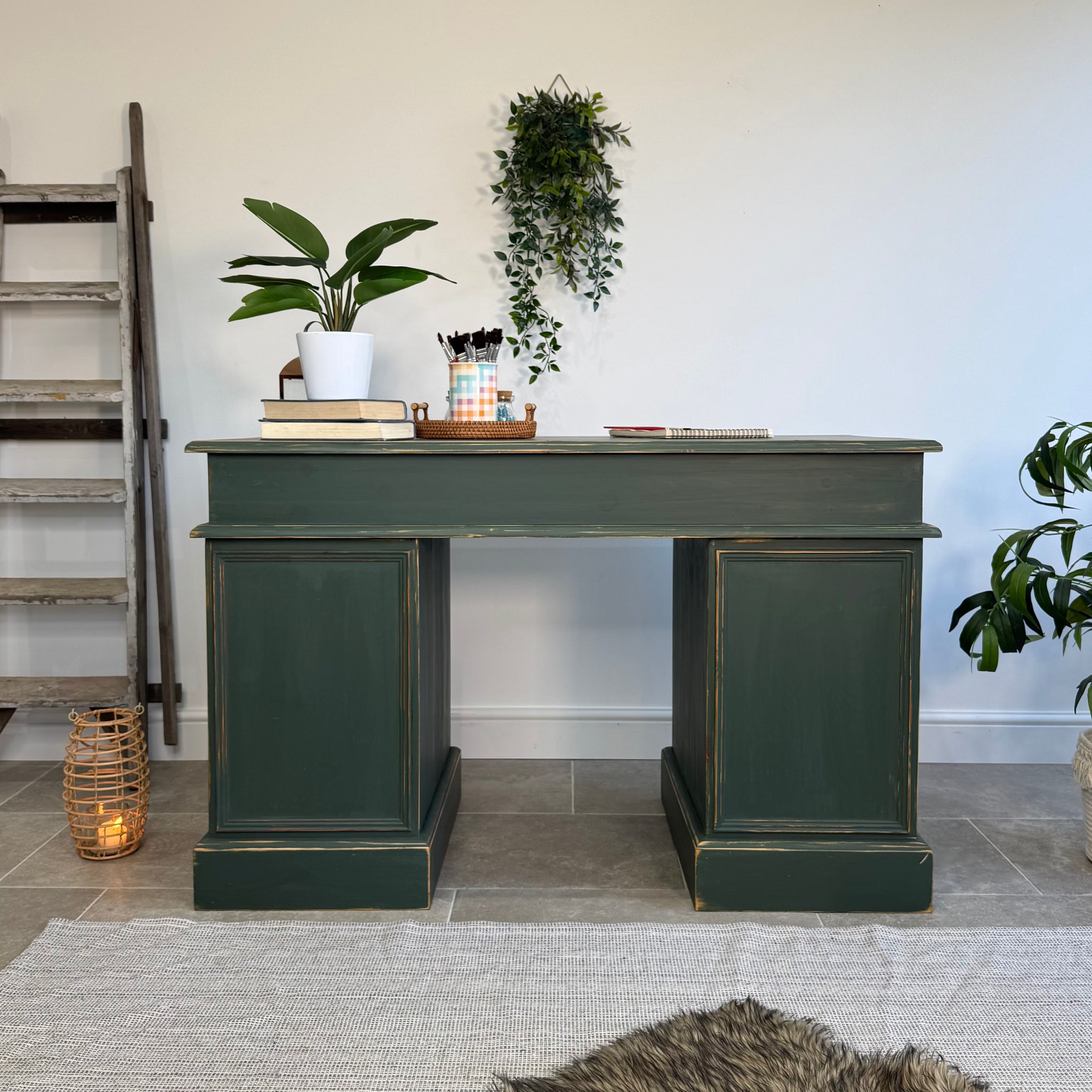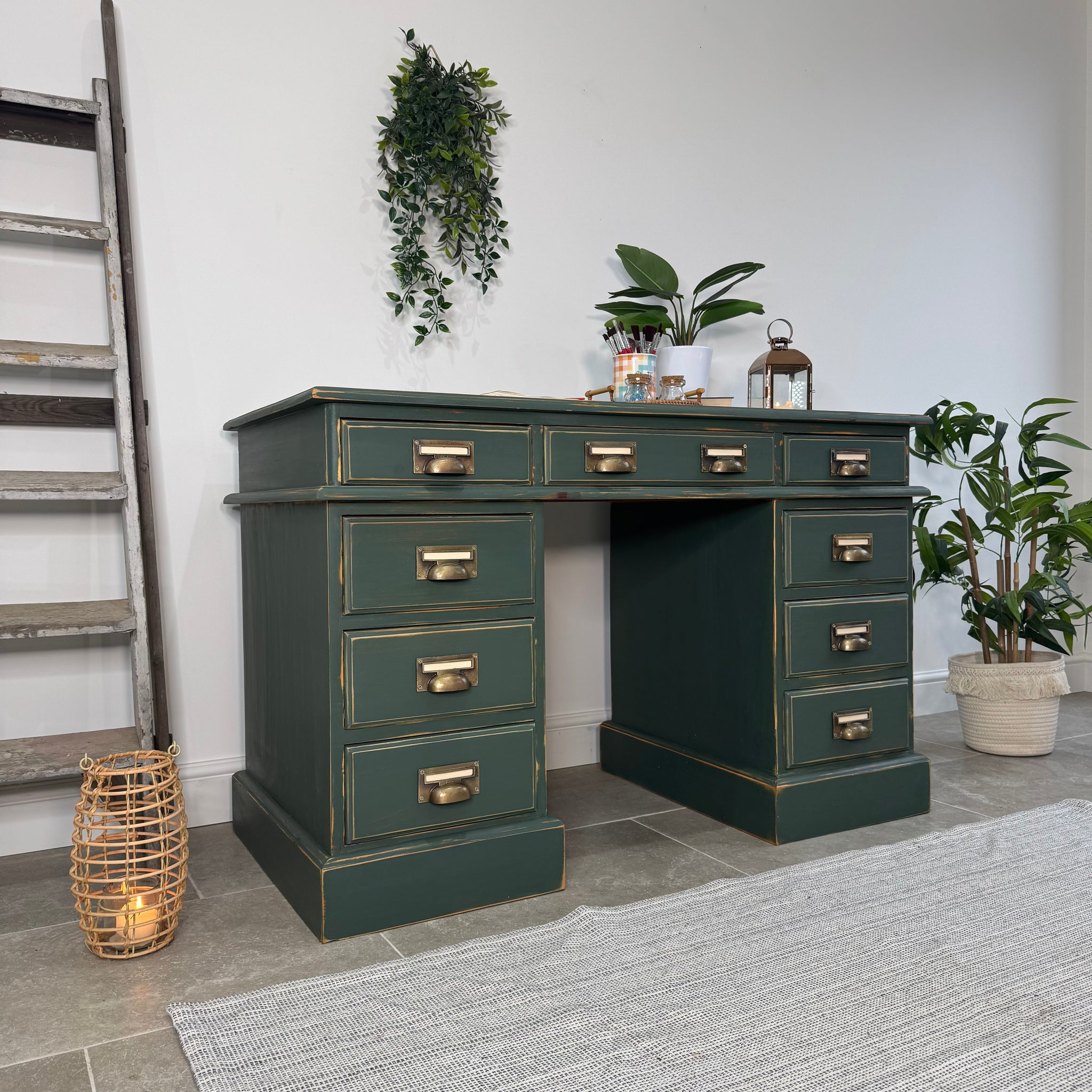Solid Pine Dark Green Captains Desk - Vintage Industrial Style