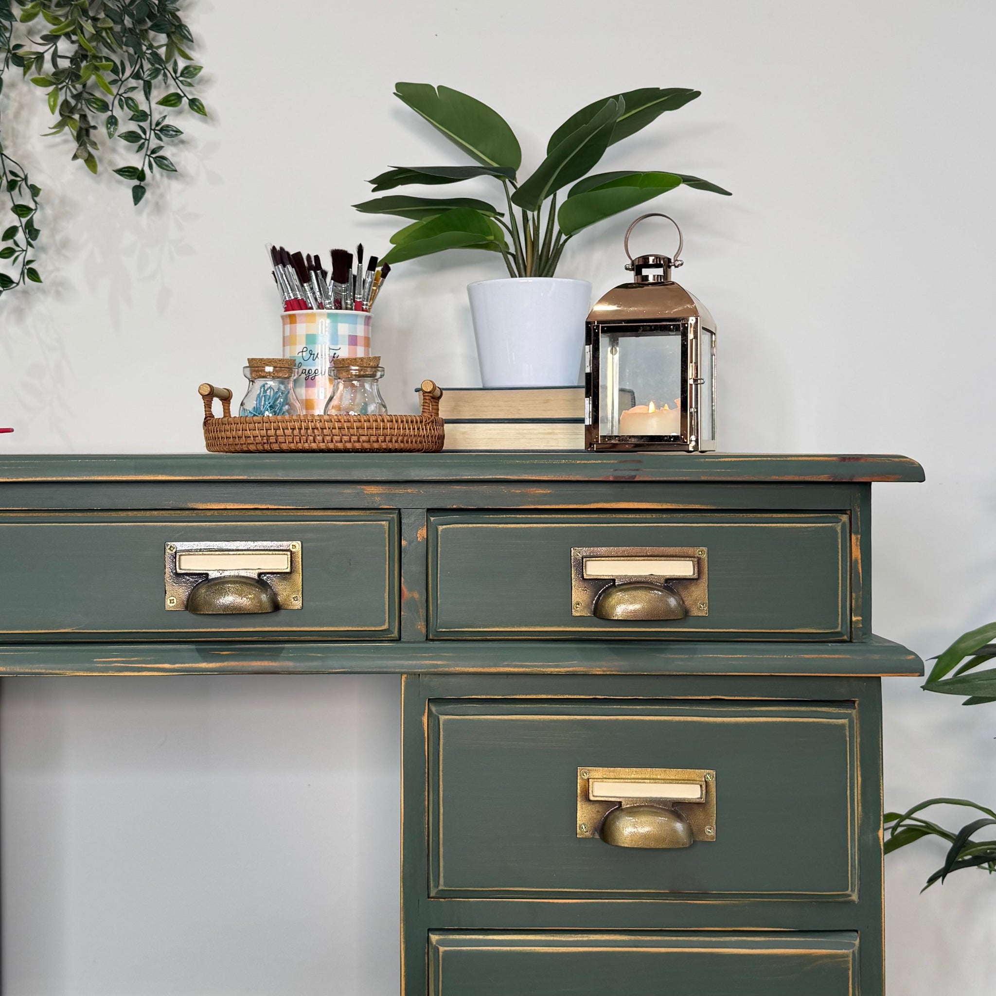 This solid pine captains desk has been painted in a rustic dark green, distressed for a vintage industrial style and then sealed for protection. We have added apothecary style card holder cup handles to finish.