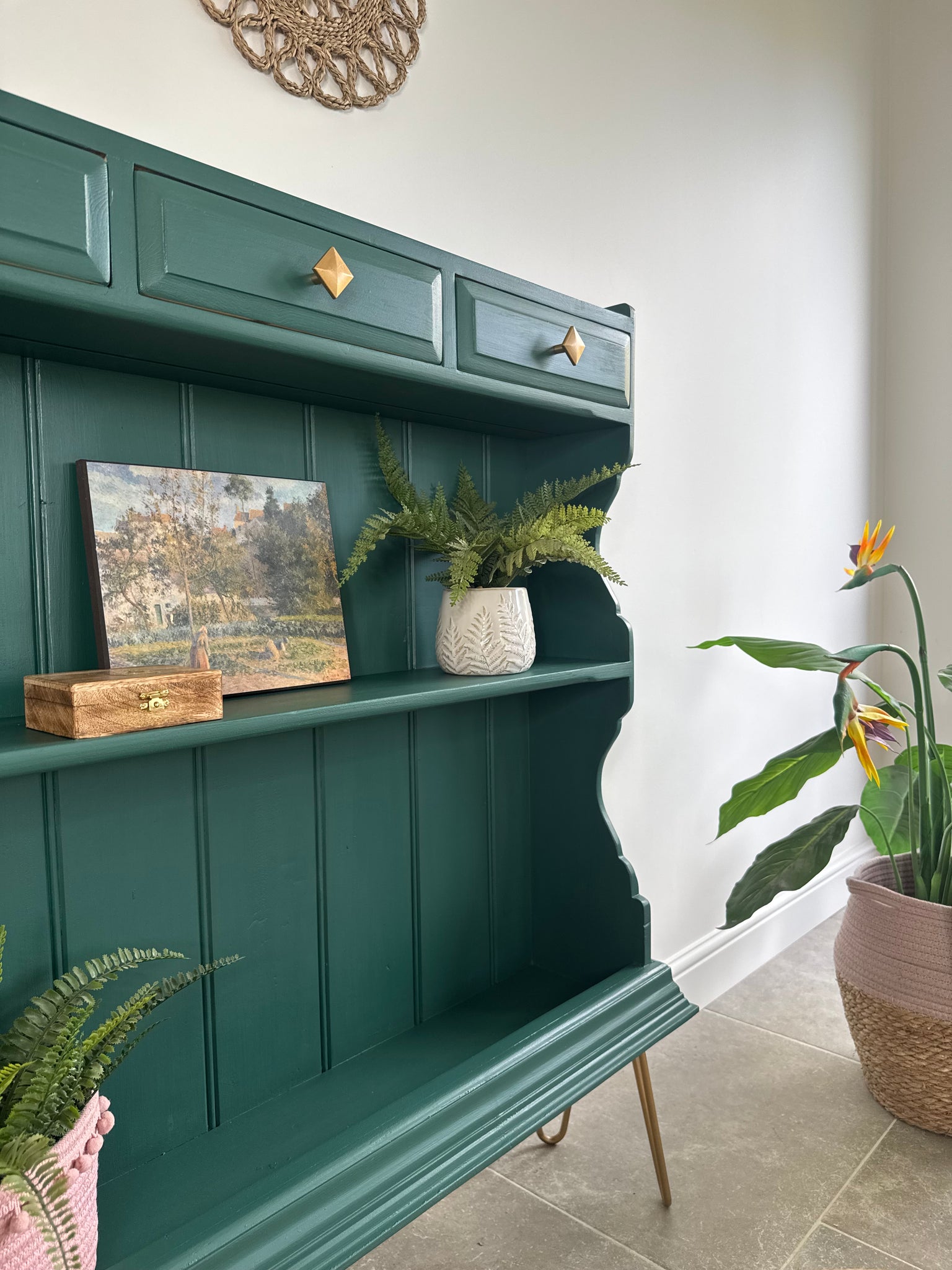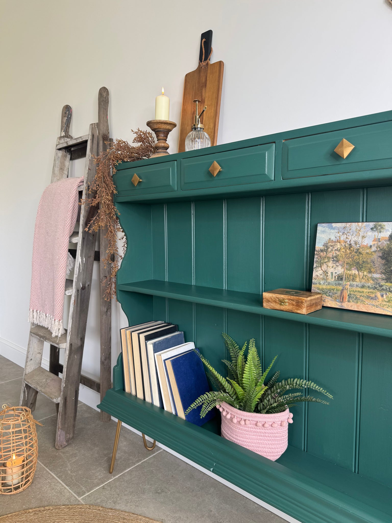 This funky unique shelving unit has been painted in a striking dark green paint, which has been sealed with a satin clear coat for protection. Gold coloured hairpin legs and handles have been added, which stand out beautifully against the green.