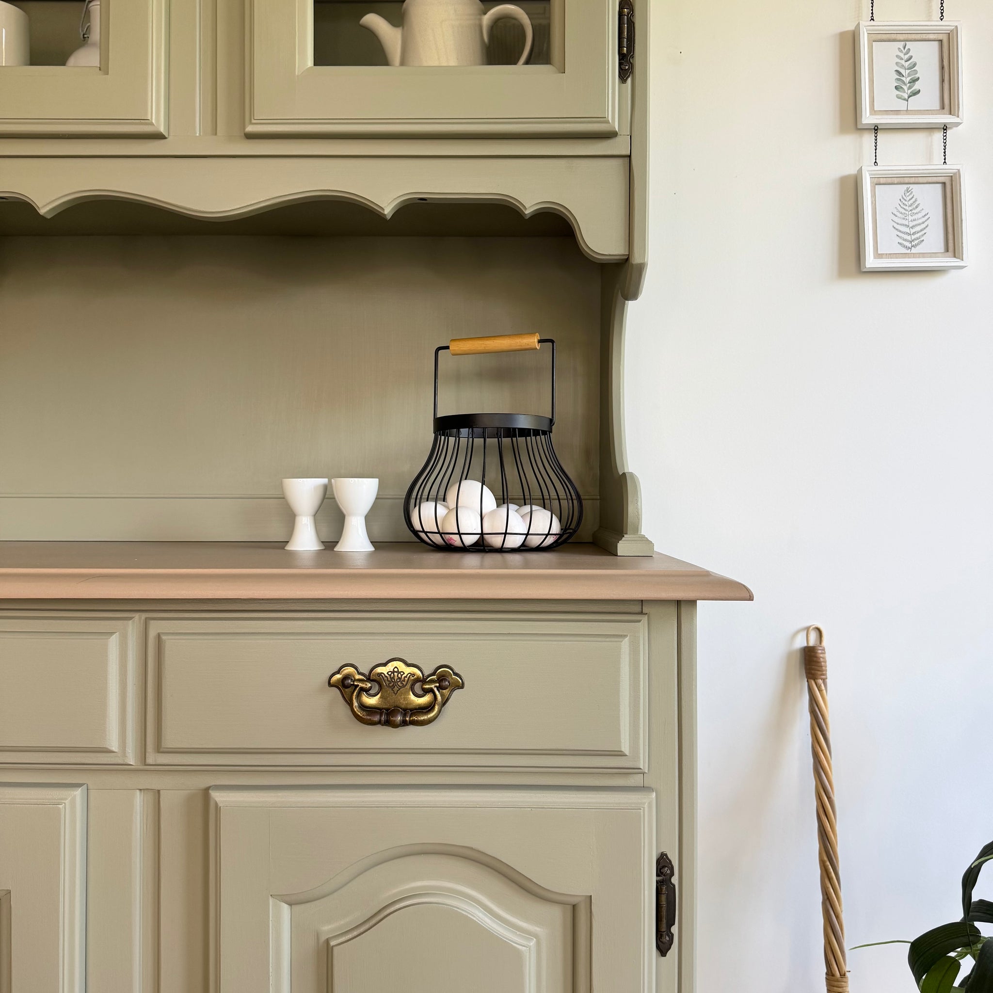 This gorgeous Welsh dresser has been updated with a lovely pale green paint, which has been sealed with a satin protective clear coat. The worktop has been sanded back, stained with a wood lightening gel stain, and again sealed for protection.