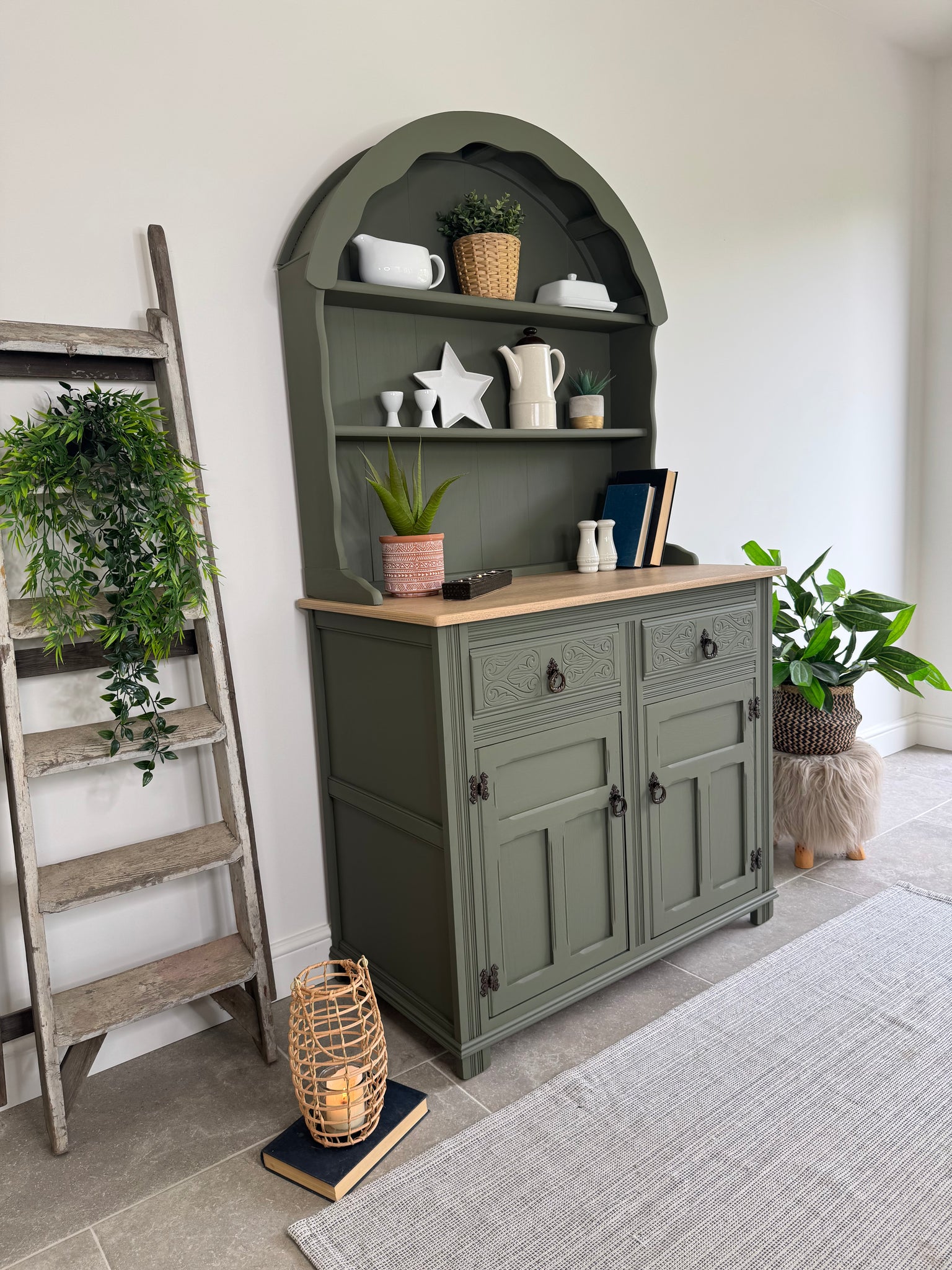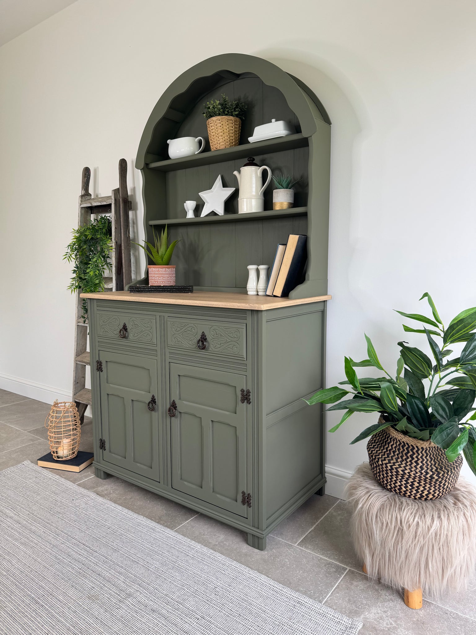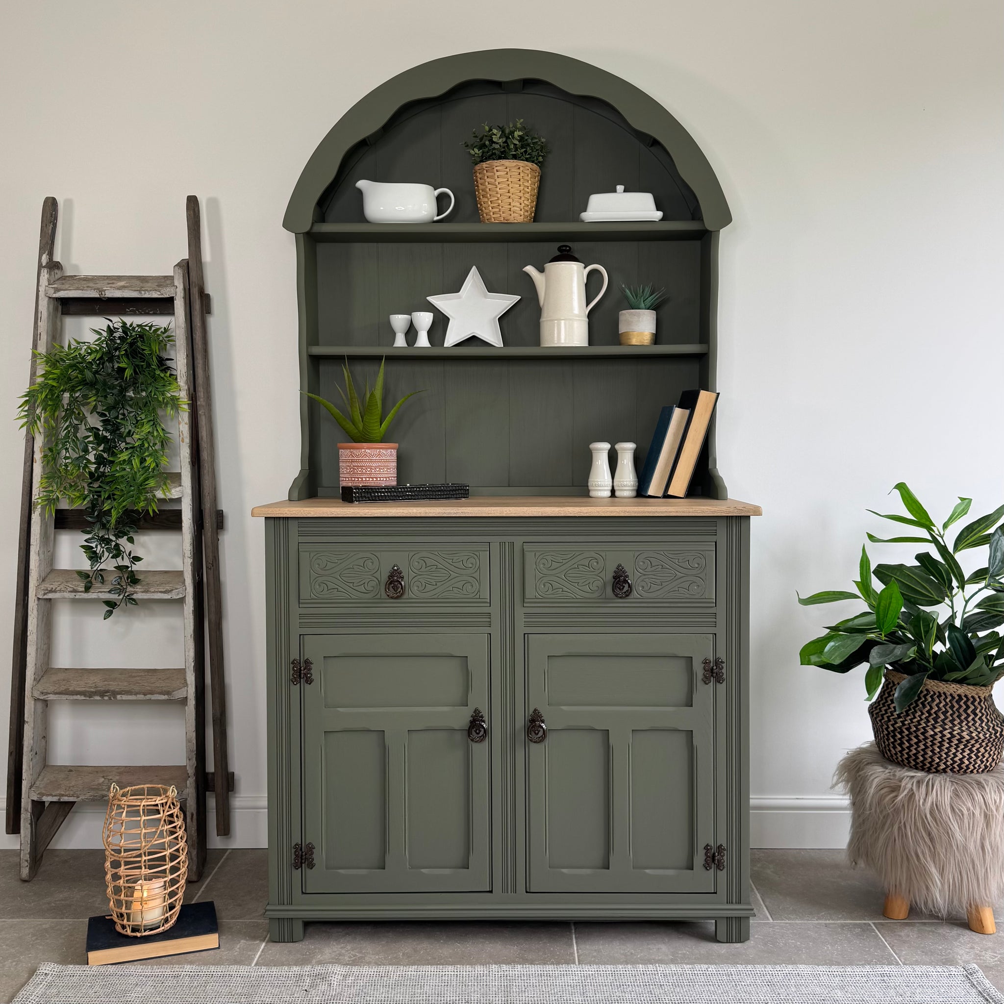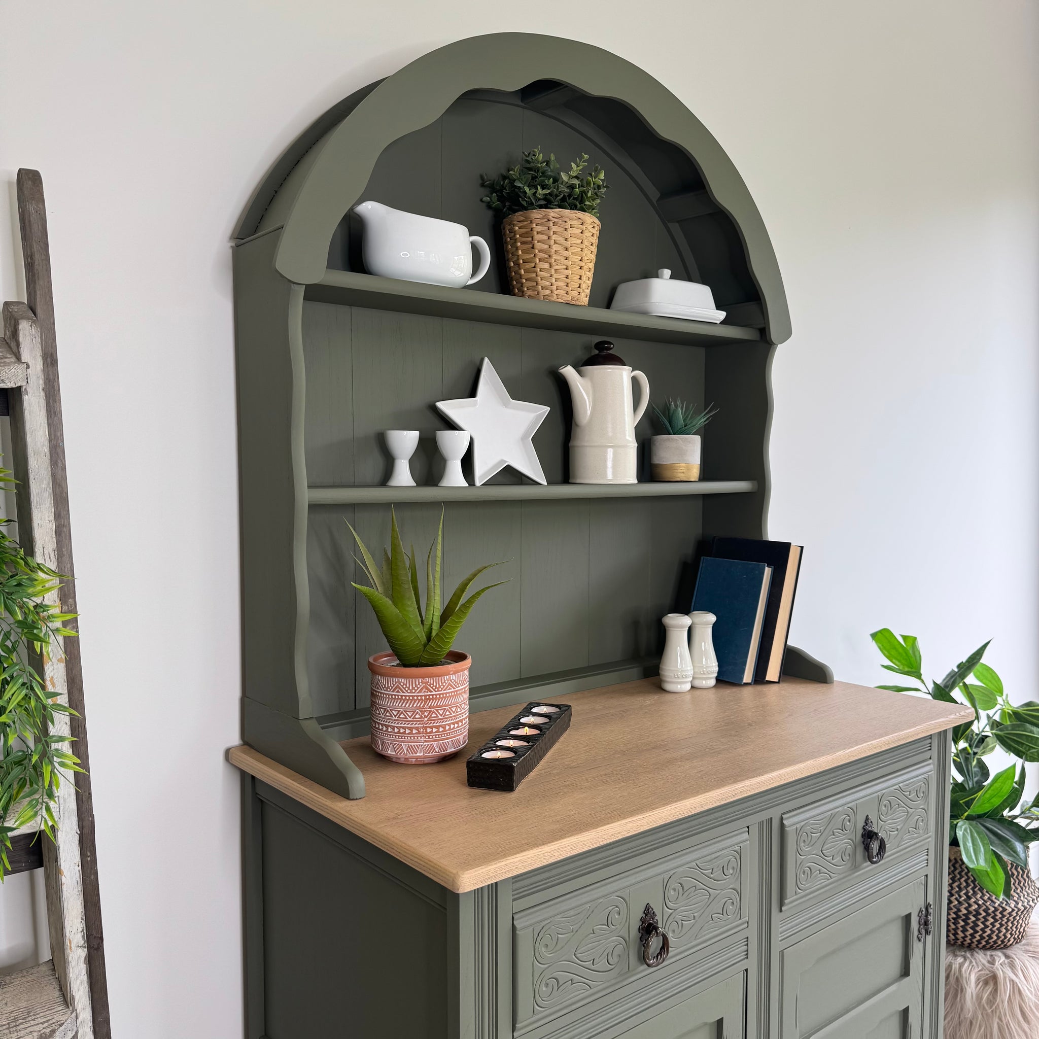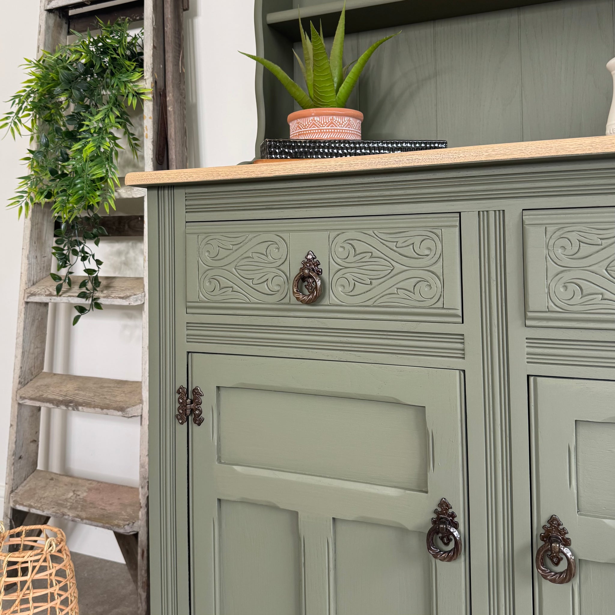 This beautiful vintage carved oak Dutch Dresser has been painted in a green mineral paint, the worktop surface has been sanded back and stained with a light wood stain, and then sealed with a matte clear coat for protection.