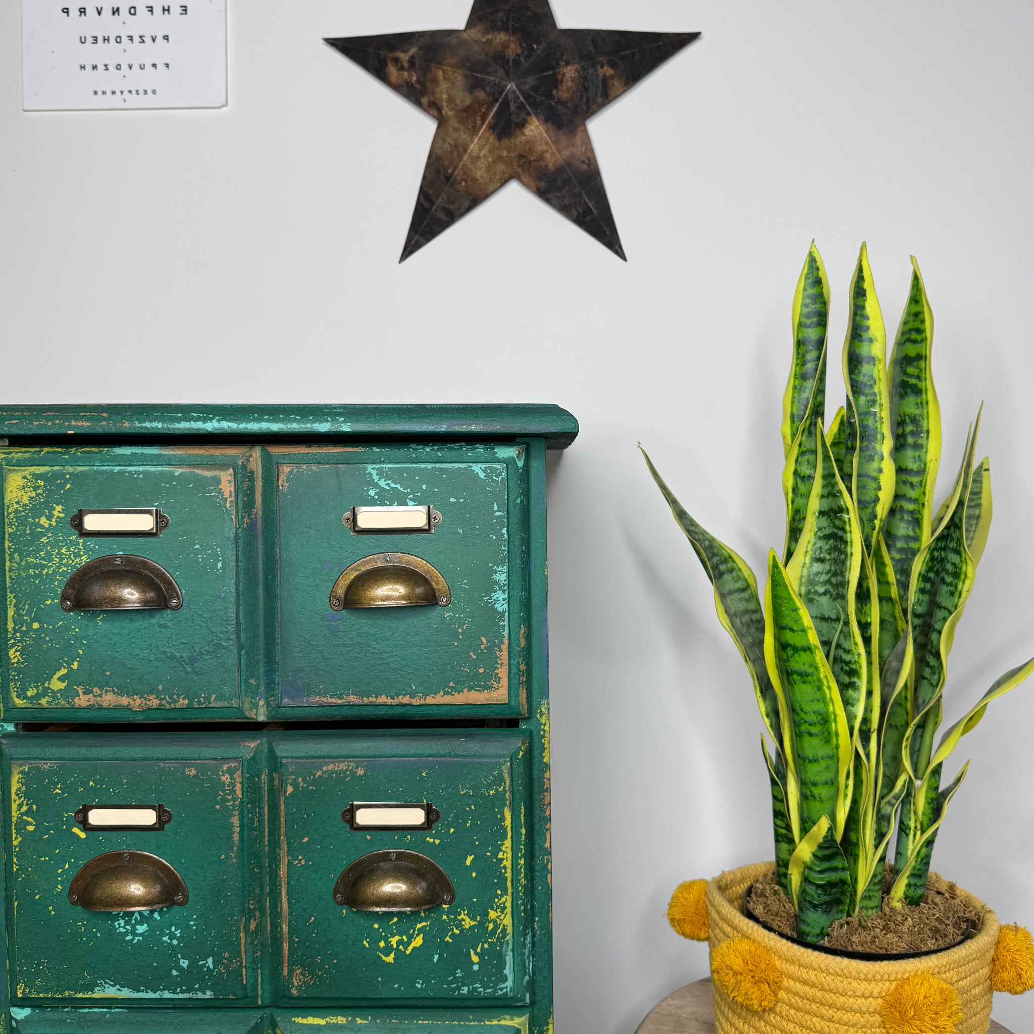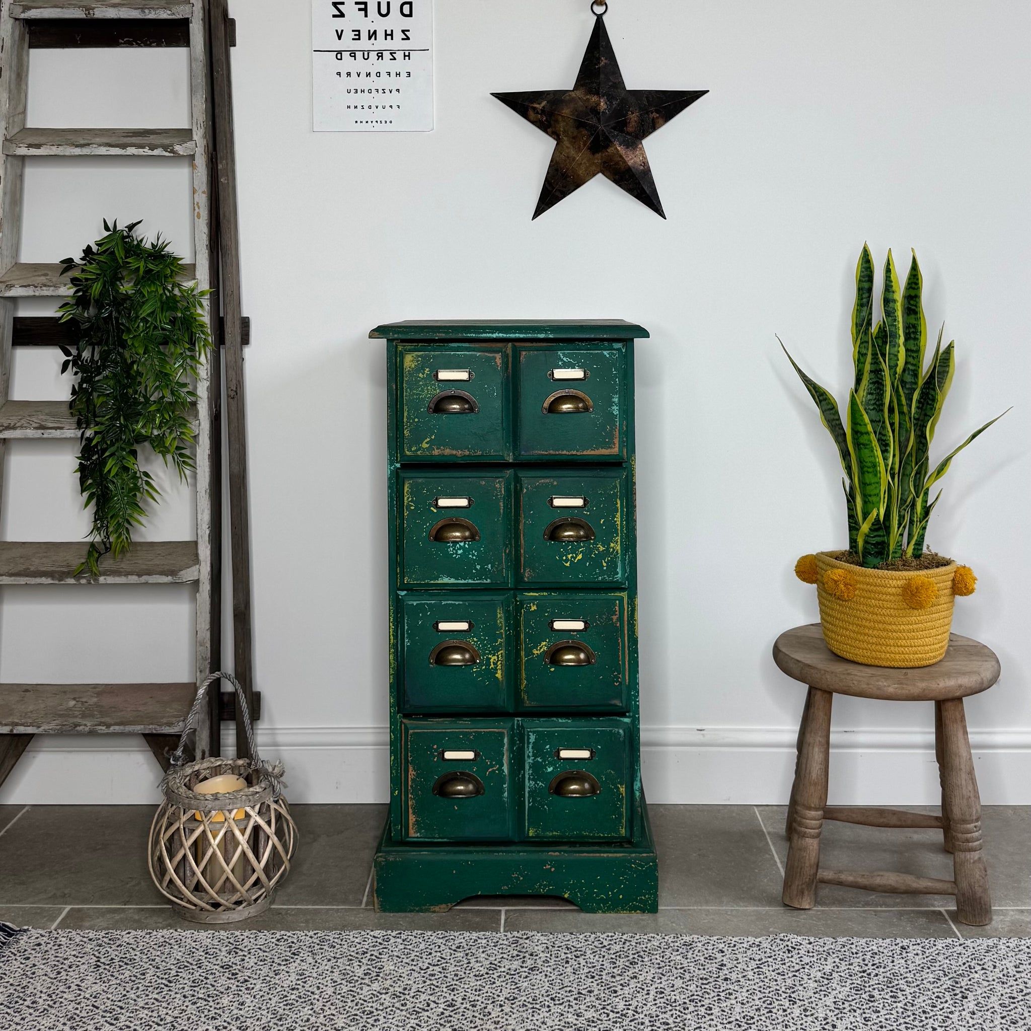 This pine chest of drawers has been given a rustic colourful makeover using textured layers of a variety of clay paint colours, in a vintage industrial style. Sealed with a protective clear coat, and brown wax applied to add age. Finished with apothecary style cup handles and card holders.